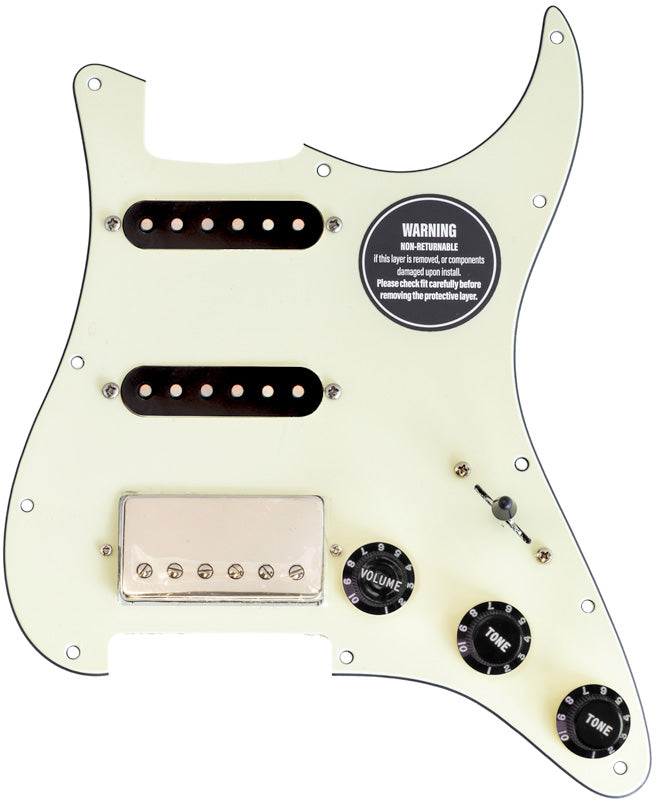 • HSS loaded pickguard showing 3 ply mint green with parchment white pickup covers and knobs