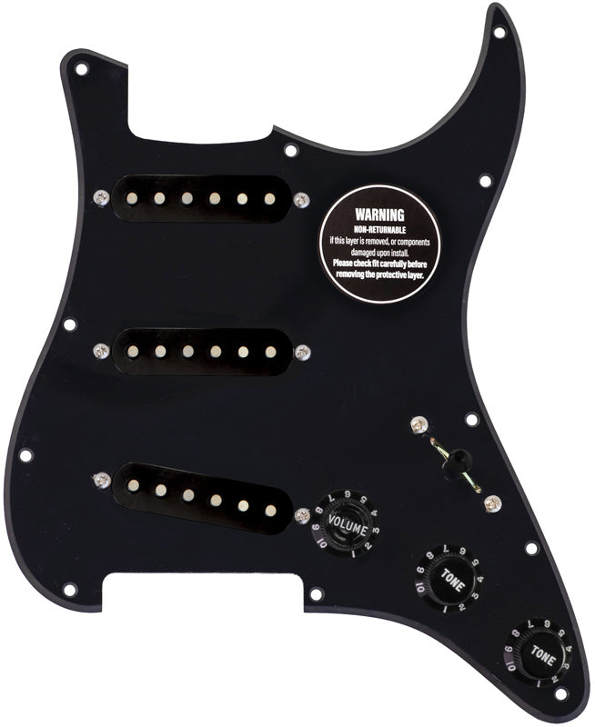 • ObsidianWire 1 Ply black loaded SSS pickguard with parchment white pickup covers, and parchment white knobs