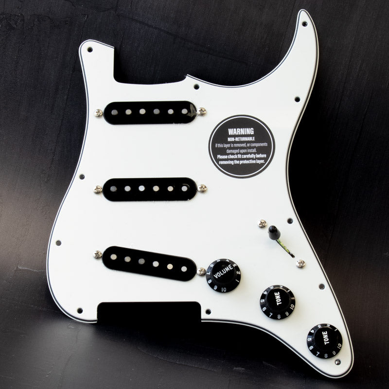 • ObsidianWire 3 Ply black loaded HSS pickguard with aged white pickup covers, and aged white knobs