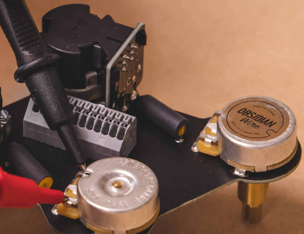 Vintage braided pickup wire being installed correctly in an ObsidianWire harness for Les Paul